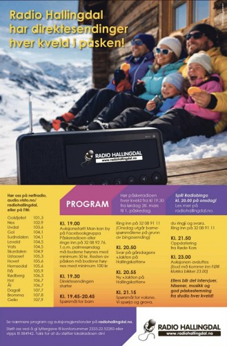 Hver dag fra og med lørdag 28. mars til og med 1. påskedag har vi auksjon i Radio Hallingdal. Her stiller dekningsområdets foreninger og bedrifter med gjenstander som lytterne kan by på. Bedriftens logo kommer på nettsiden og Facebooksiden vår. I tillegg blir bedriften og bidraget nevnt et x antall ganger på radio i løpet av dagen!